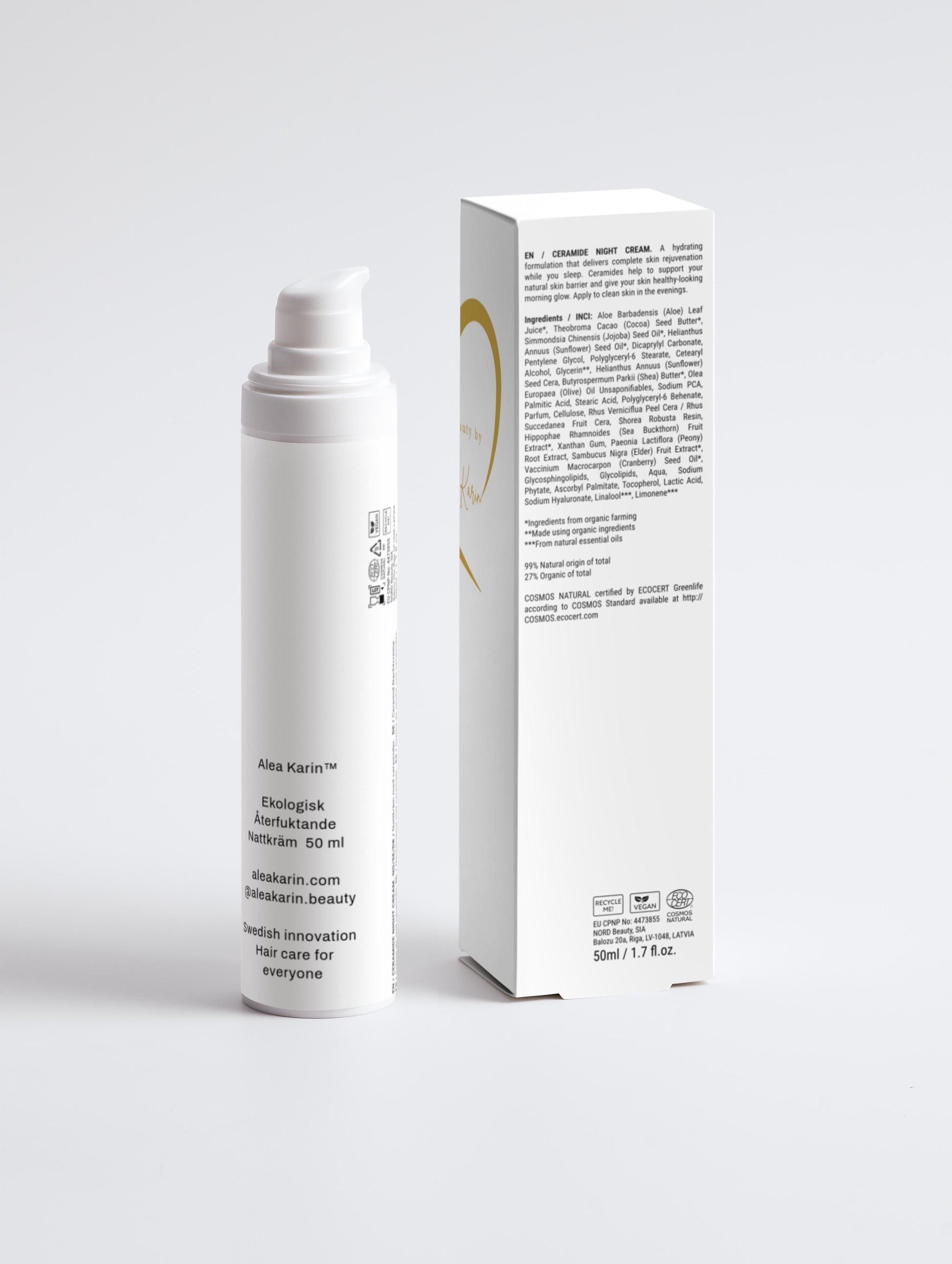 Produktbeskrivning: Ekologisk Återfuktande Nattkräm - Alea Karin är omsorgsfullt framtagen med ingredienser som arbetar intensivt medan du sover, vilket främjar hudens förnyelse och ger en strålande lyster. Den återfuktande formulan glider lätt på huden och ger en komplett föryngring över natten. Ceramider hjälper till att stärka hudens naturliga skyddsbarriär, så att du vaknar upp med en hälsosamt fräsch hud.